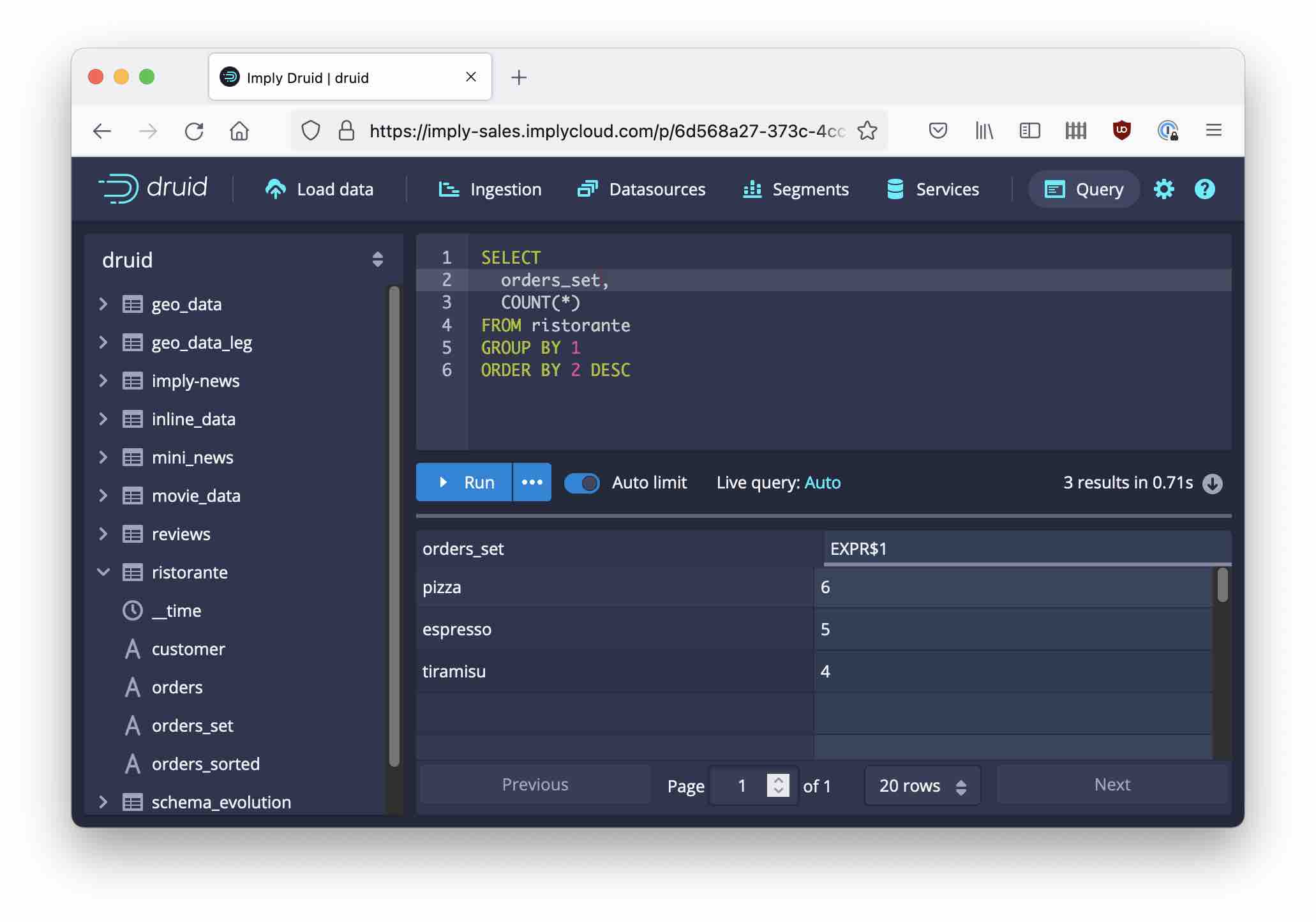 We are using the ristorante datasource from part 3, and start with the analysis how many customers bought each item: