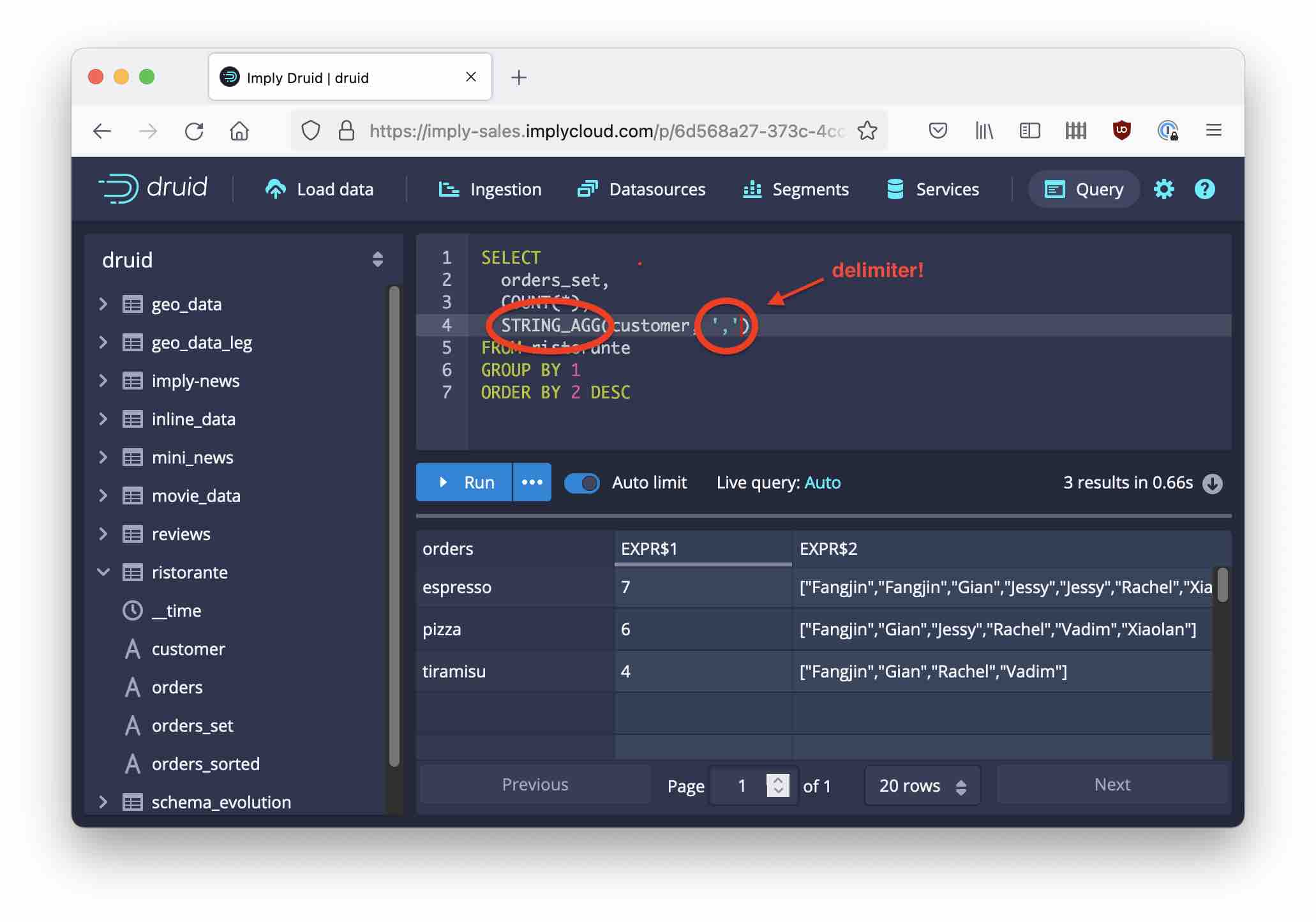 SQL arrays can be a bit unwieldy, though. For client software that cannot handle those, there is the new STRING_AGG function in Druid that concatenates the values into a string, using a configurable delimiter.
