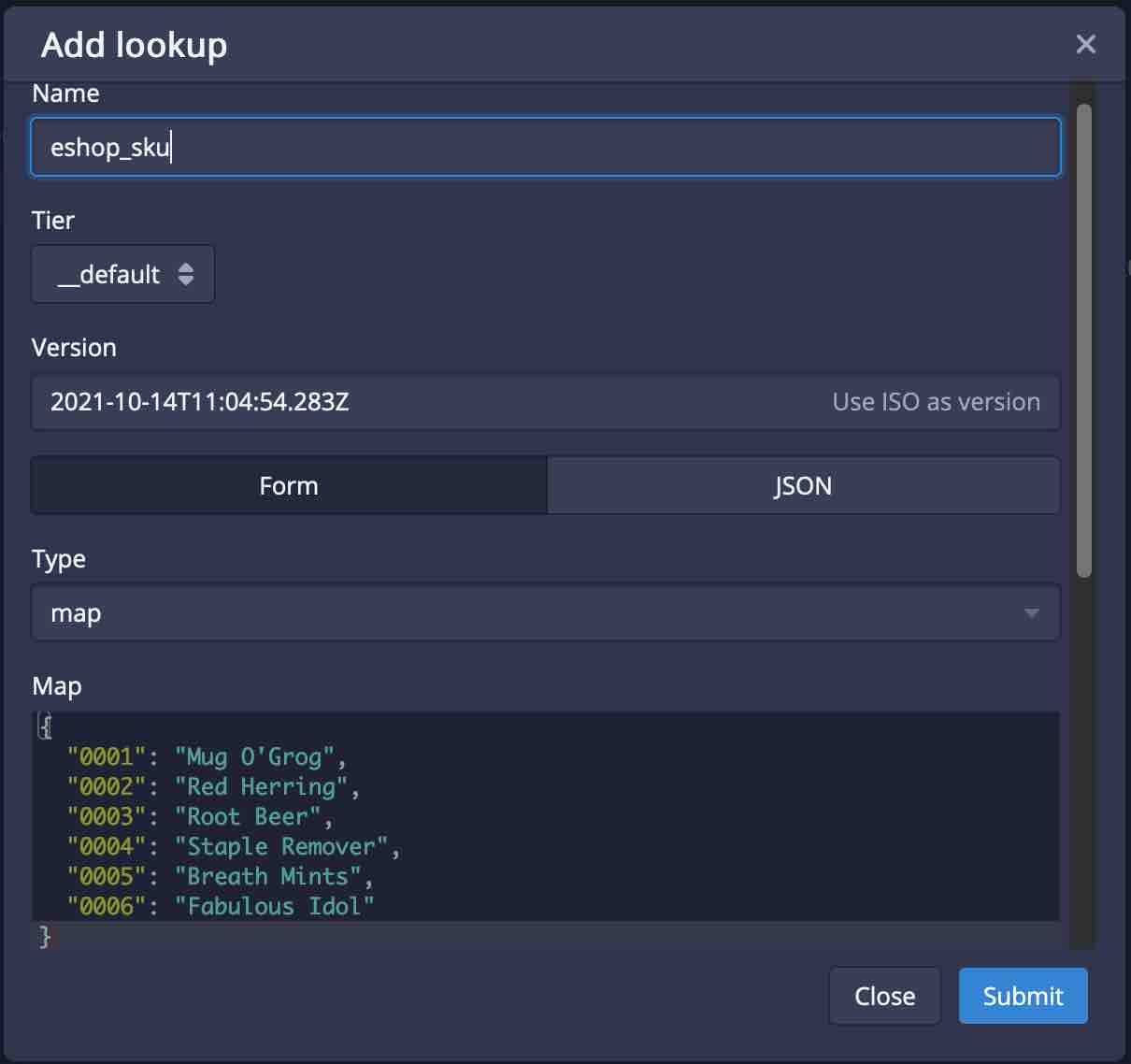 In fact, this is just the format for defining an inline lookup. From the Druid console, navigate to the Lookup wizard, choose Add lookup, and paste the snippet from above into the Map input field. Name the lookup eshop_sku: