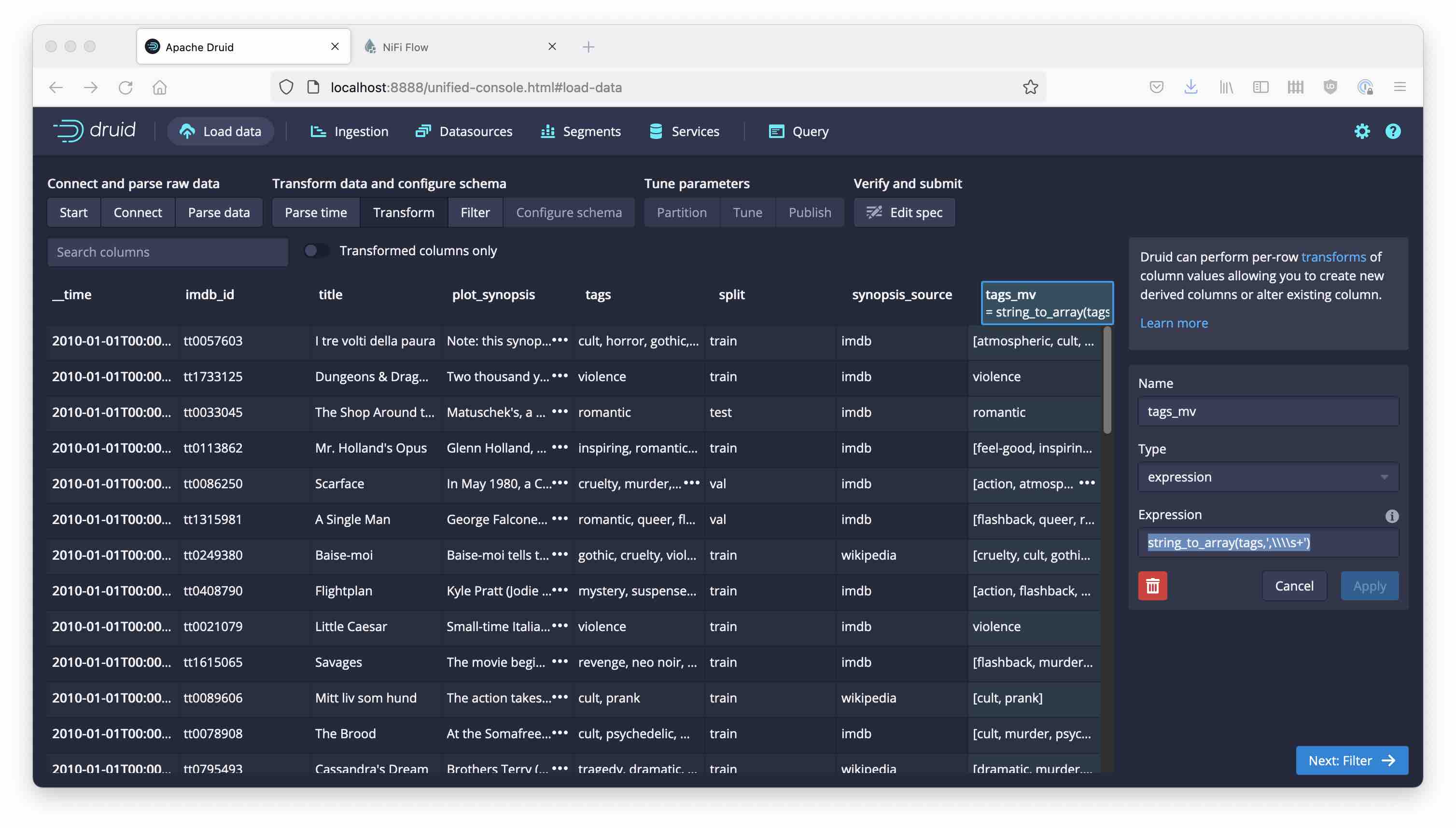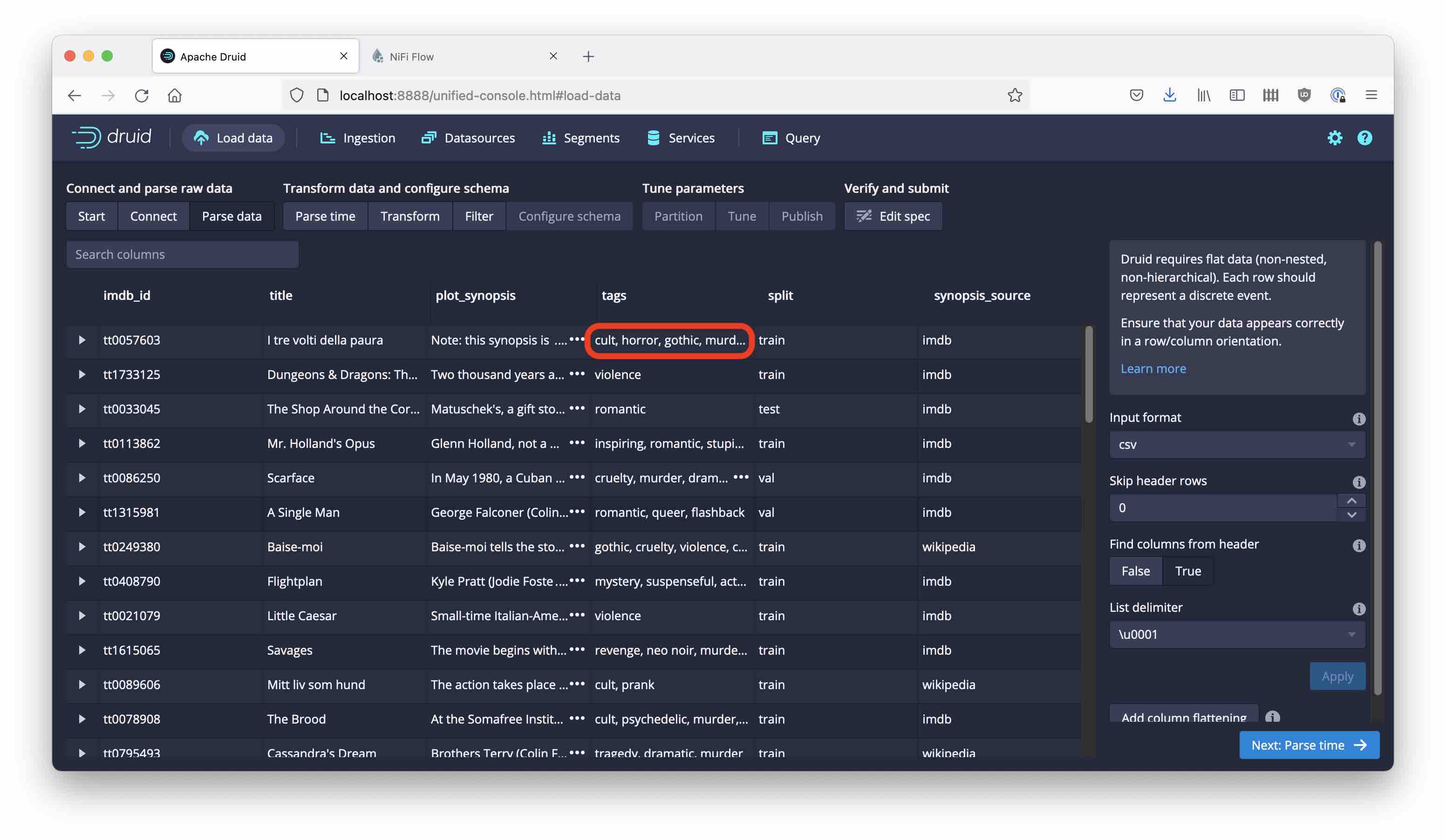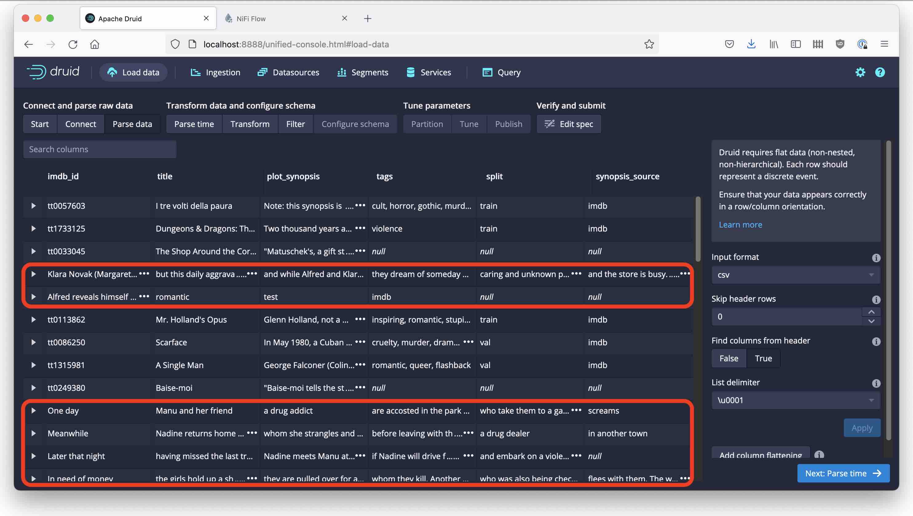 Apparently, the plot_synopsis field of our data file contains multi-line strings. Druid’s parser cannot handle linefeeds inside CSV fields, so we need to resort to some preprocessing. If we can somehow parse the CSV, replace all the linefeeds inside the data field with spaces, and write the result back, we should be fine.