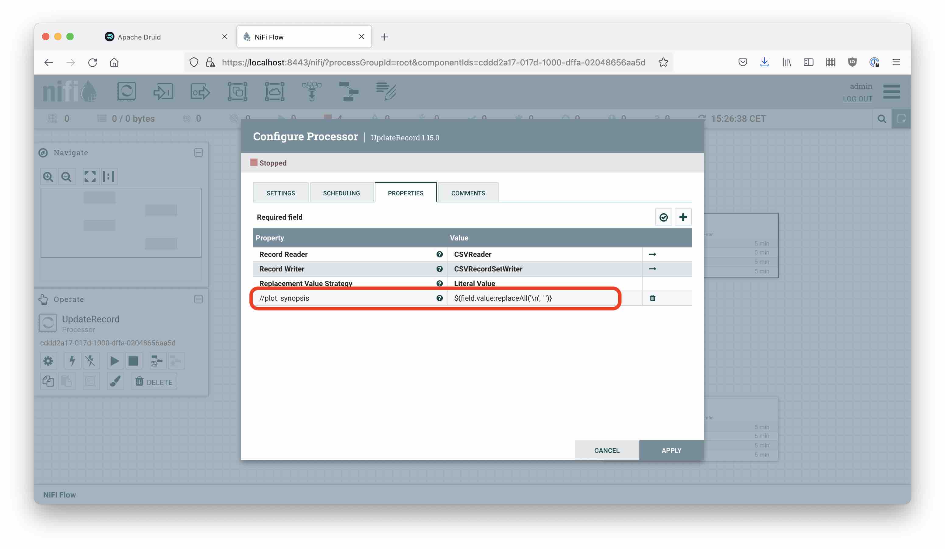 So, we read the original file and feed the result into an UpdateRecord processor. This processor parses its input using a CSV Reader, and then replaces the plot_synopsis field like this: