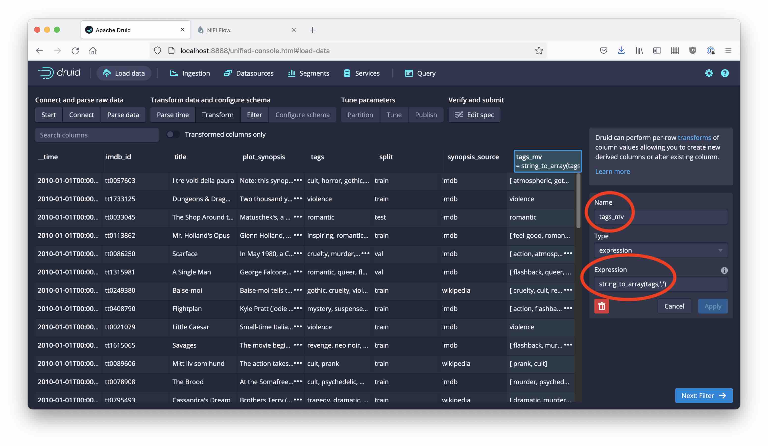 You cannot use the same character for the field and list delimiters in the Druid wizard. (You can try it: you will get an error.) But there’s another thing we can do: we can build the multi-value tags dimension using a transform! Let’s try this: create a new transform and use this expression: